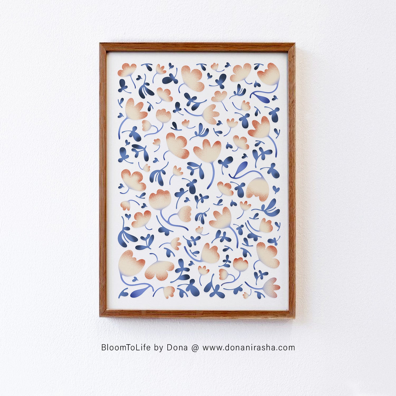 Invite warmth and serenity into your space with Peach Reverie, a gentle dance of stylised florals in soft peach, orange, and calming blue. This printable wall art evokes a sense of quiet joy and emotional ease, perfect for bedrooms, creative studios, or healing corners.